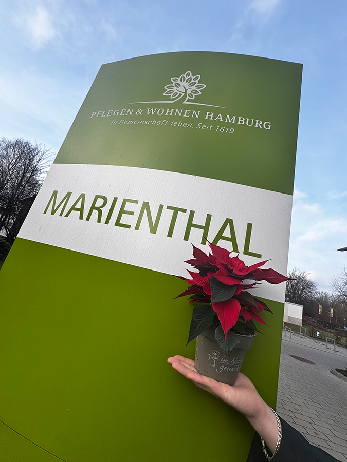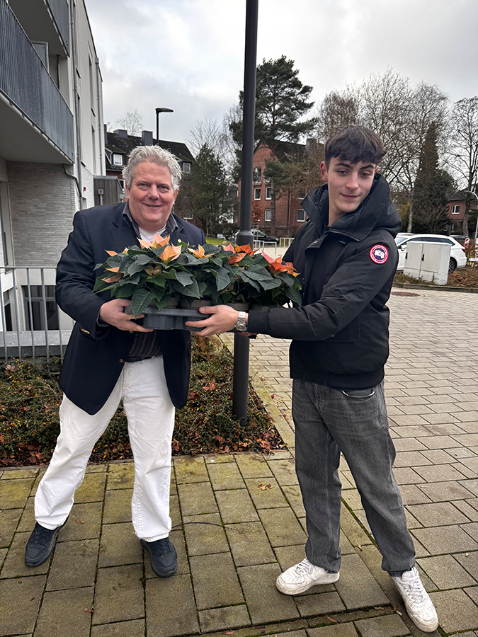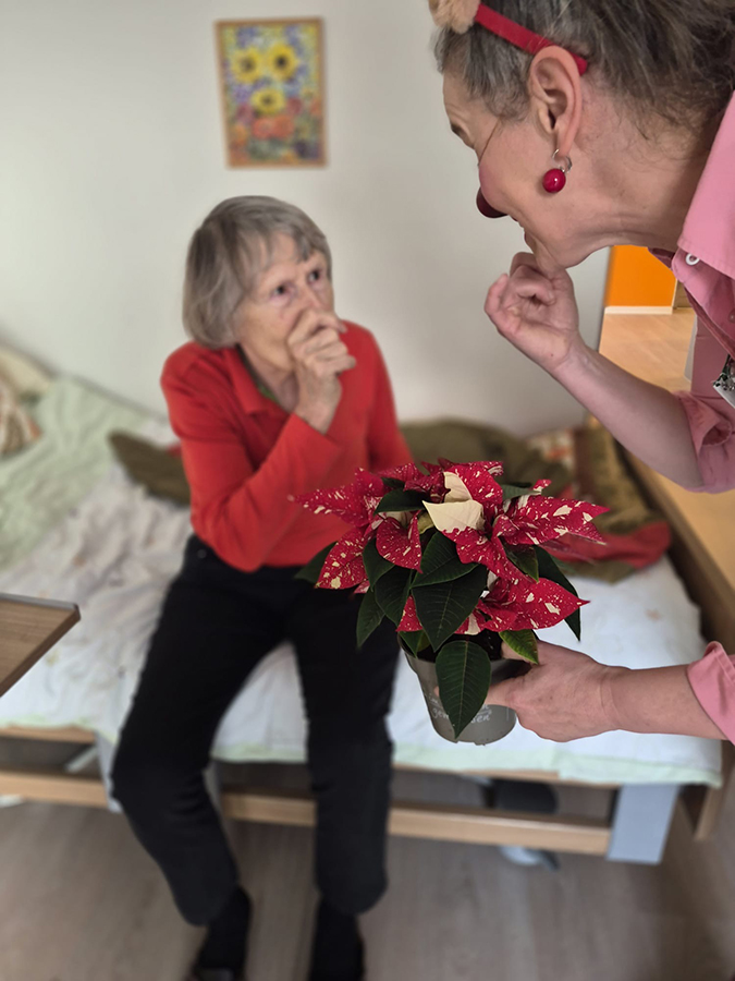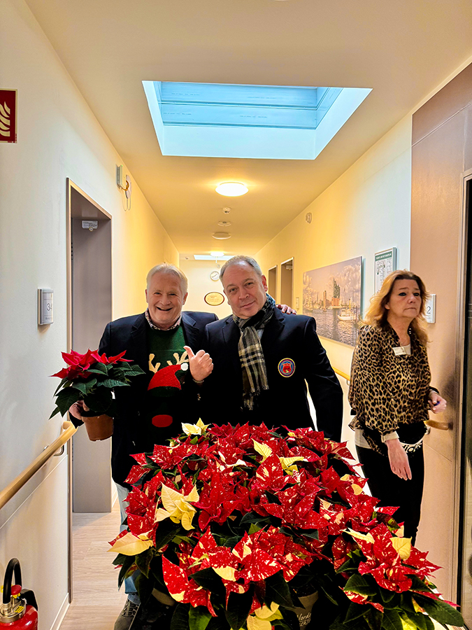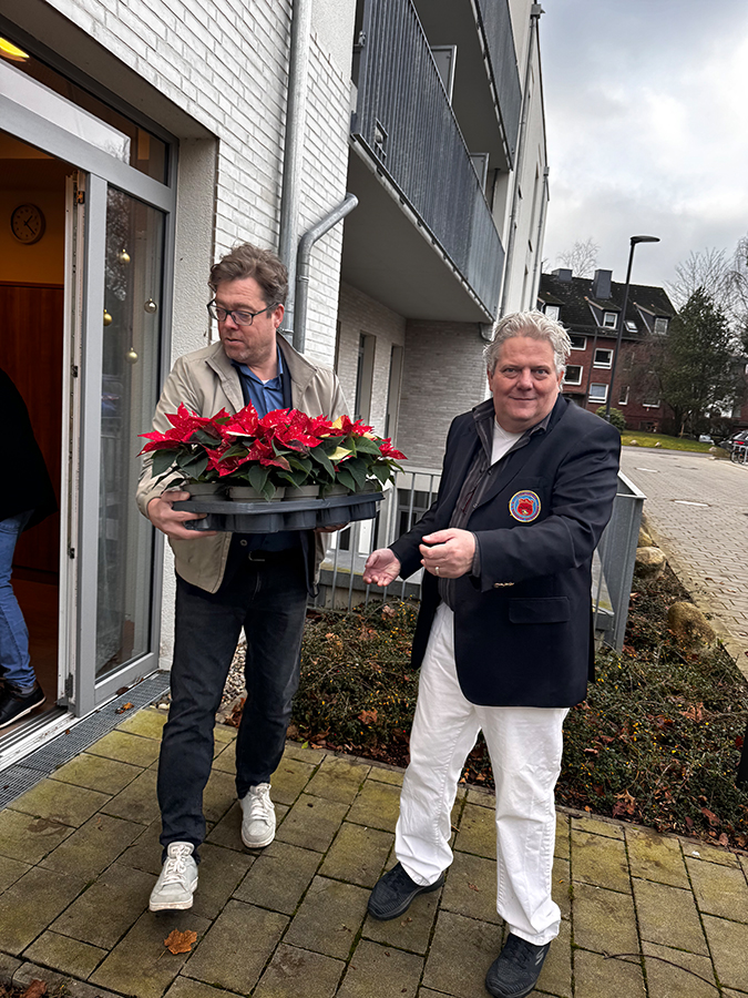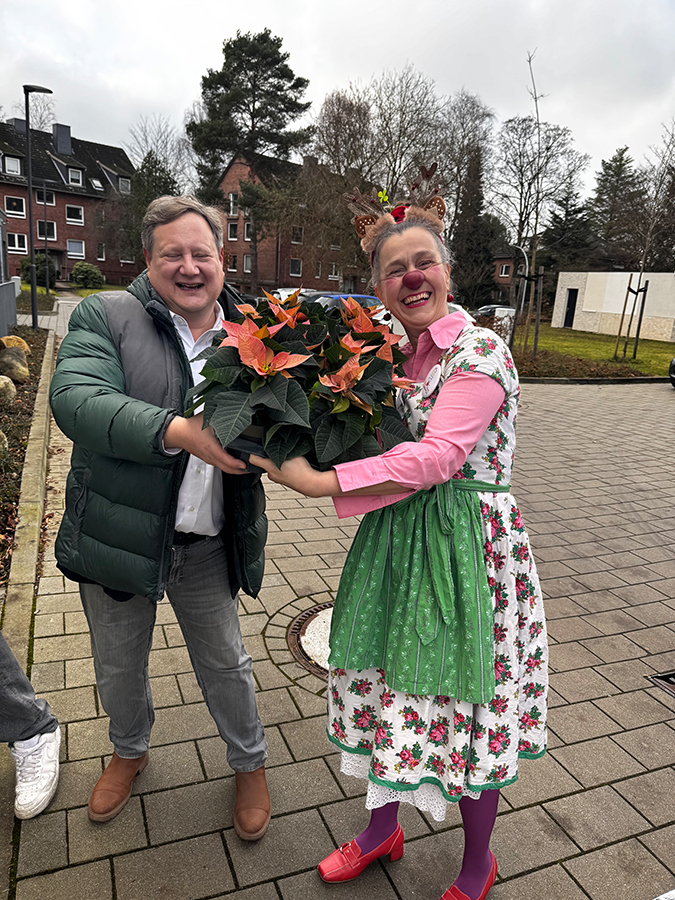 Mit 300 blumigen Weihnachtsgrüßen, die uns erneut der Gärtnereibetrieb Kotzam aus dem schleswig-holsteinischen Gönnebek sponserte, standen wir am 3. Adventssonntag in der Eingangshalle des Neubaus. Bei der Verteilung unterstützte uns die Seniorenclownin JoJo, die mit viel Einfühlungsvermögen, Humor und ihrer roten Nase für fröhliche Überraschungen sorgte – und die Bewohnerinnen und Bewohner zum Schmunzeln brachte.