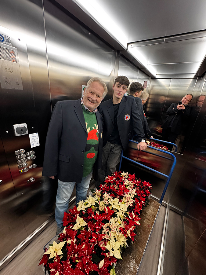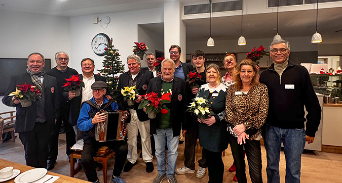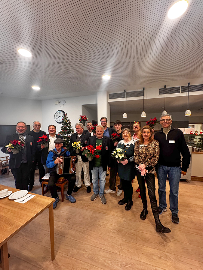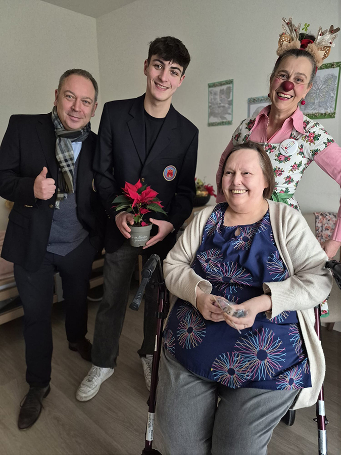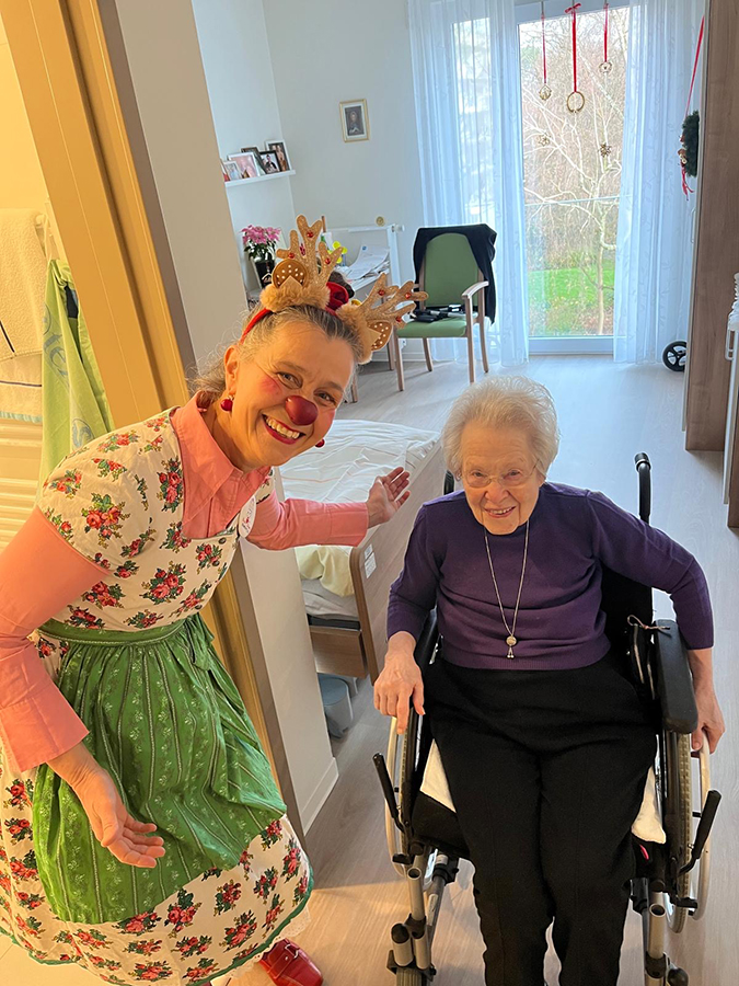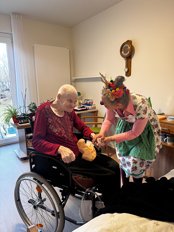 Mit 300 blumigen Weihnachtsgrüßen, die uns erneut der Gärtnereibetrieb Kotzam aus dem schleswig-holsteinischen Gönnebek sponserte, standen wir am 3. Adventssonntag in der Eingangshalle des Neubaus. Bei der Verteilung unterstützte uns die Seniorenclownin JoJo, die mit viel Einfühlungsvermögen, Humor und ihrer roten Nase für fröhliche Überraschungen sorgte – und die Bewohnerinnen und Bewohner zum Schmunzeln brachte.